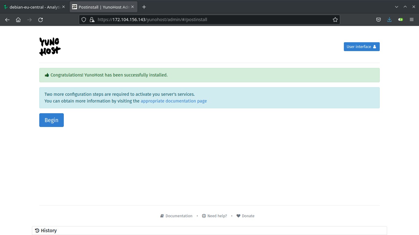 Go to the URL (https://<server ip>/, and accept the self-signed certificate). You need to open port 80, 443 on your server’s firewall if they are not already open. You can also run the post-installation script using the command line (run as root): yunohost tools postinstall (I think the CLI process is easier).