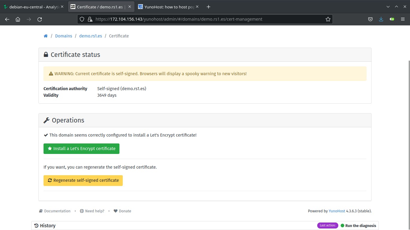 Before that, ensure you can access YunoHost with your configured domain and go to Domains, click on the domain and add a new LetsEncrypt SSL certificate, so you can go to https://your-domain.com without seeing that horrible certificate warning. To be able to add the certificate, you need to have configured DNS records for IPv4 and IPv6. After creating the certificate, checked that it works.