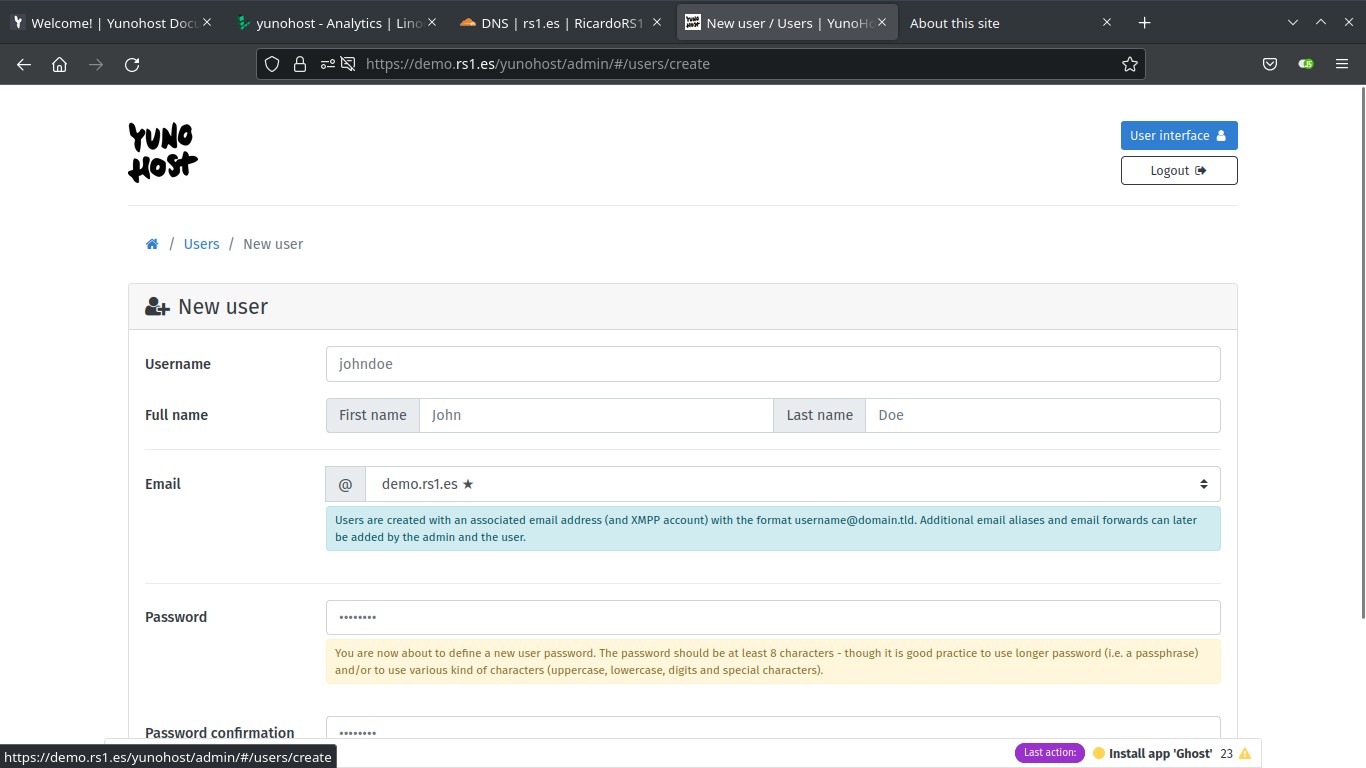 Now, you need to create your first user. Go to Users and add a new one. You can also run yunohost user create <username>.