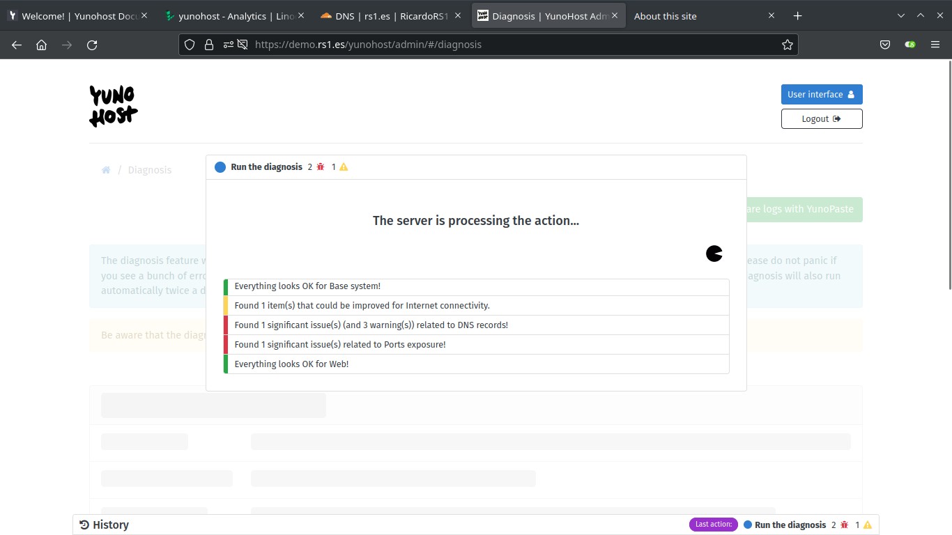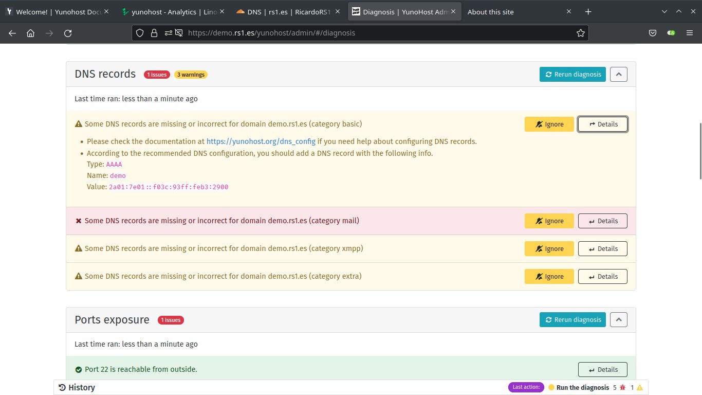 You may need to add more DNS entries (for IPv6, email, etc.). To find what entries you need to add, go to Diagnosis. After diagnosis is finished, under DNS records you’ll see some warnings. Click on Details in each warning to see the DNS records you need to add on your domain provider admin page (you may not need to add all of them if you aren’t going to use email or XMPP services, but add the AAAA IPv6 record at least, in addition to the A IPv4 record you added earlier).